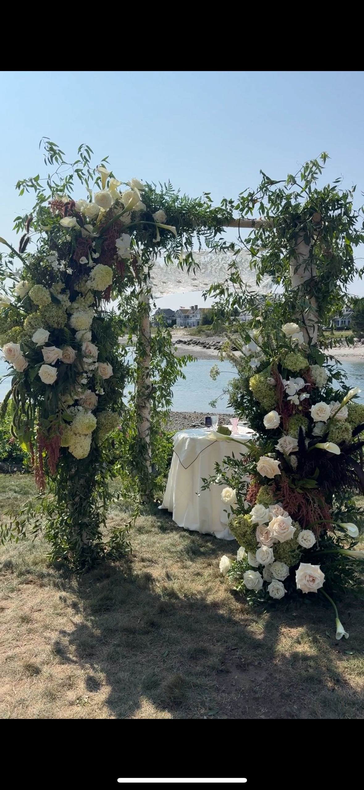 Wedding arch decorated with white and cream flowers, greenery, and draped fabric, set outdoors near a body of water with houses in the background at the Breakwater Inn in Kennebunkport, Maine