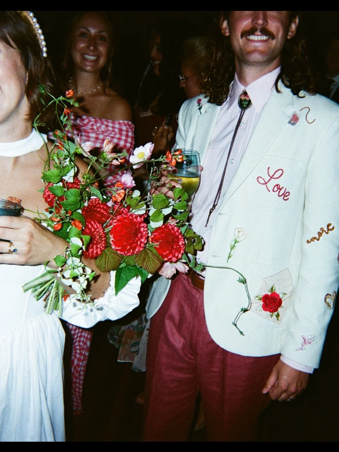 Maine grown wild and seasonal bridal bouquet of dahlias, raspberry, and anemone