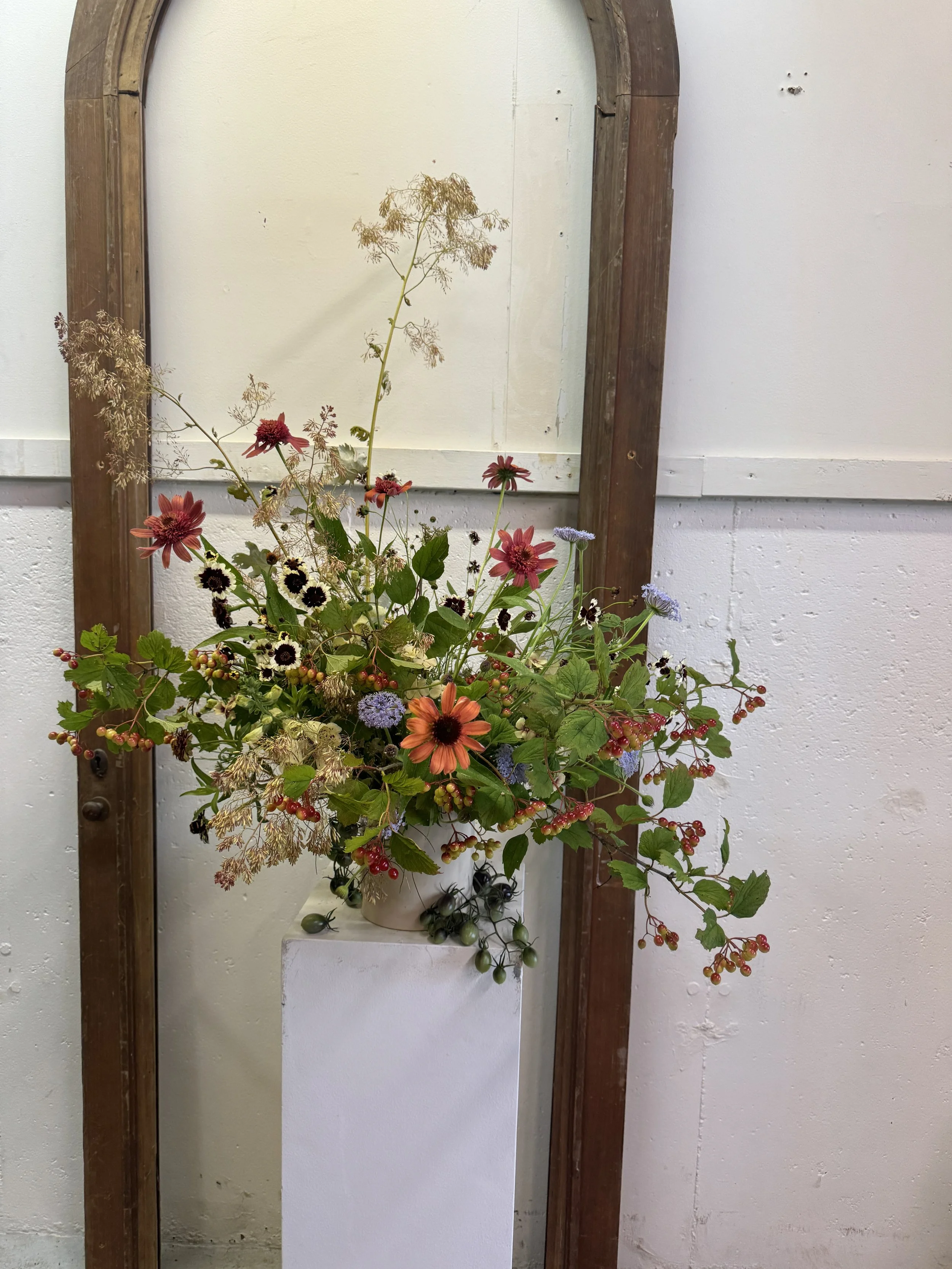 A mixed floral arrangement in a white vase, placed on a white pedestal against a white wall with a wooden framing.
